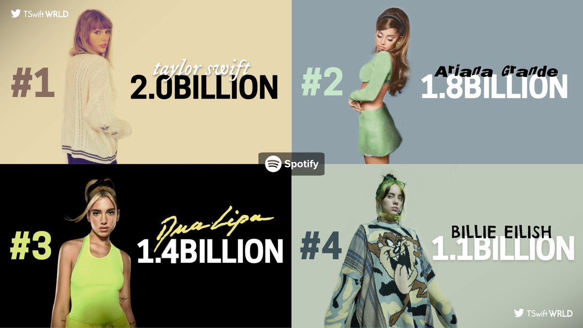 Taylor Swift World On Twitter Most Streamed Female Artists Of 2021 On Spotify So Far 1 Taylorswift13 2 04b 2 Arianagrande 1 84b 3 Dualipa 1 41b 4 Billieeilish 1 16b Https T Co Tqafxwv3g6 Twitter